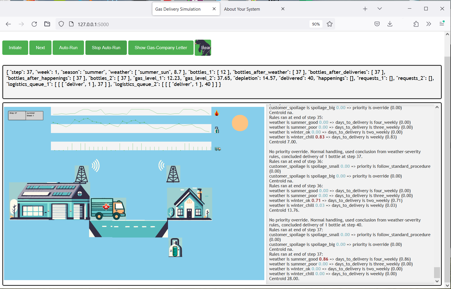 To access the system, please go to https://expertsystemdemos.net/sim_gas.html . Do this on a laptop or desktop computer rather than a phone, as the simulation needs ample screen space for pictures and diagnostics.